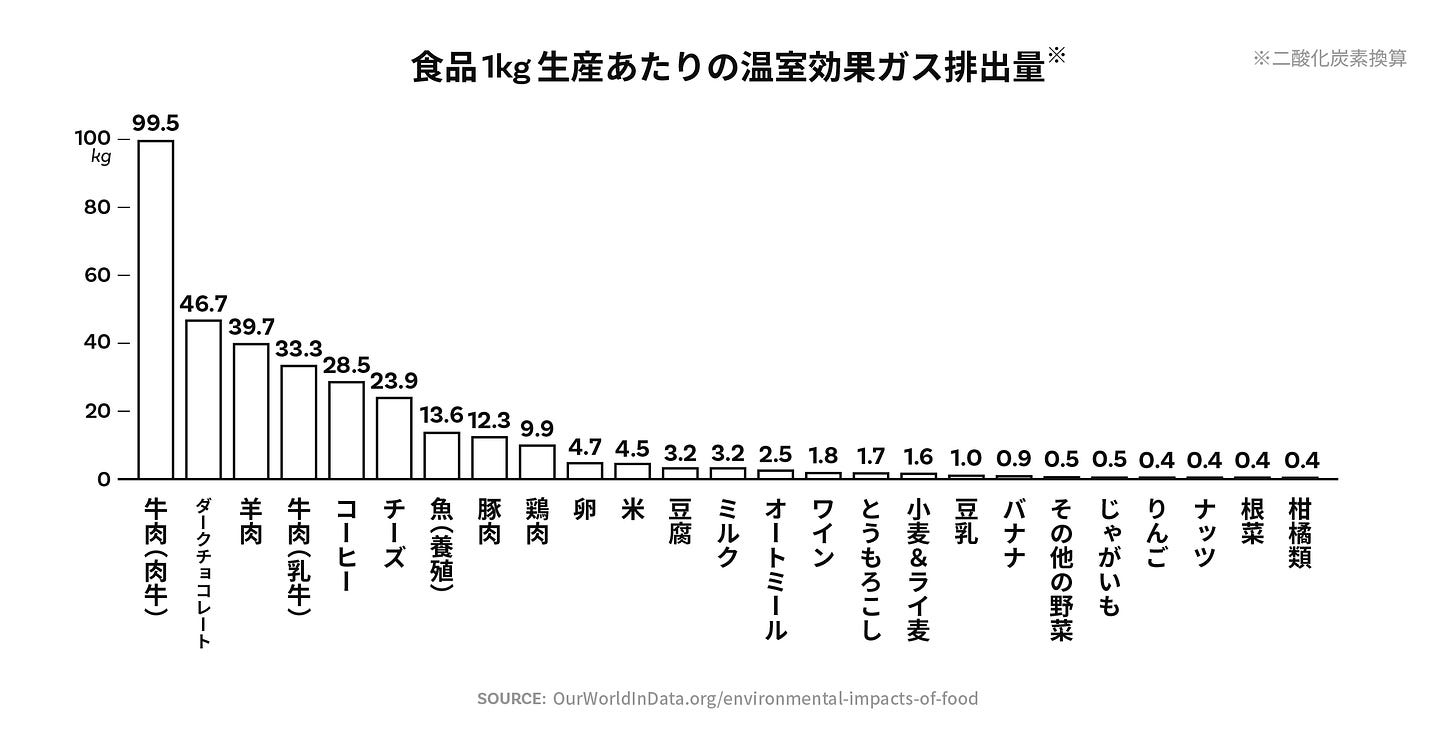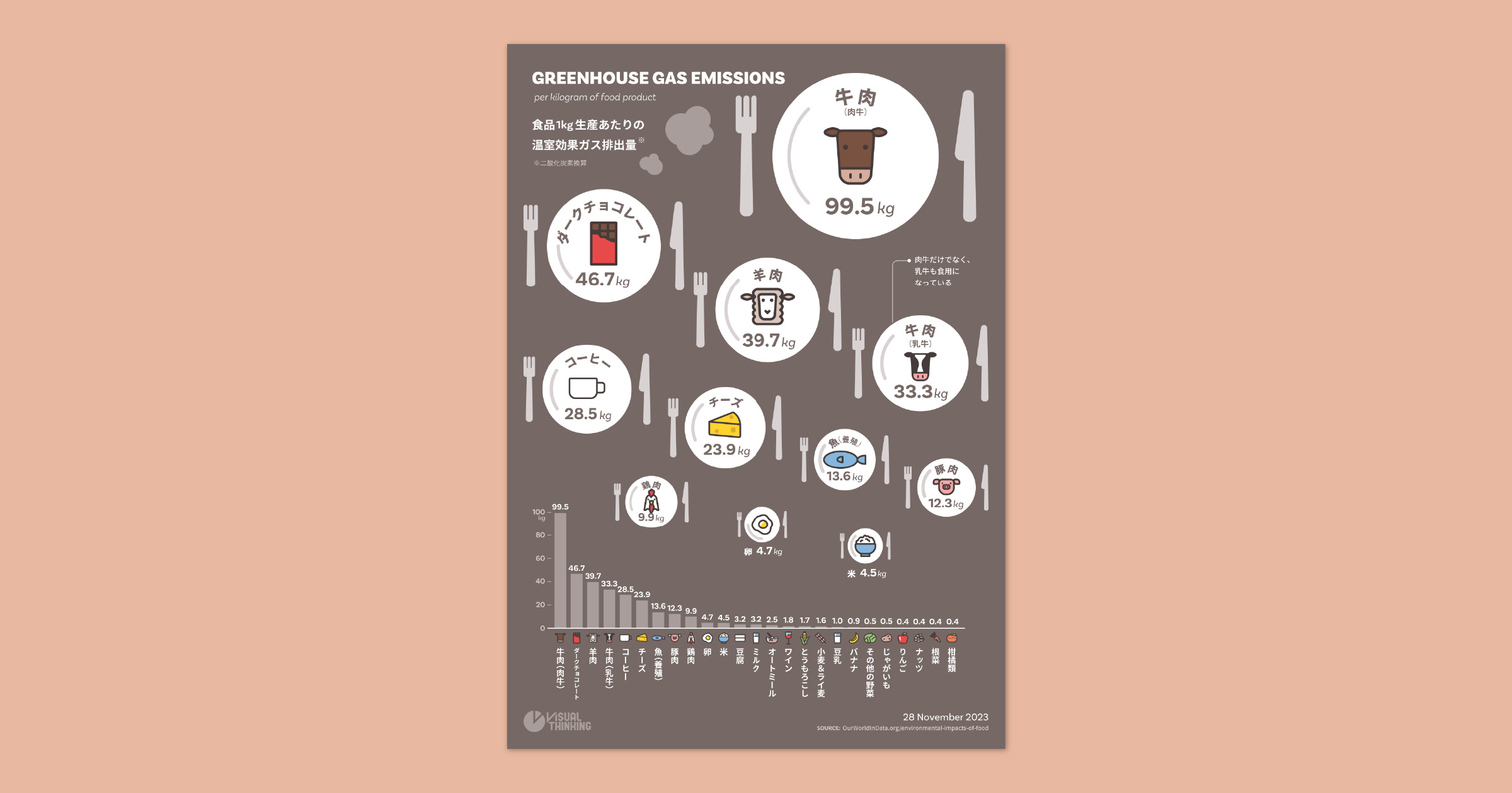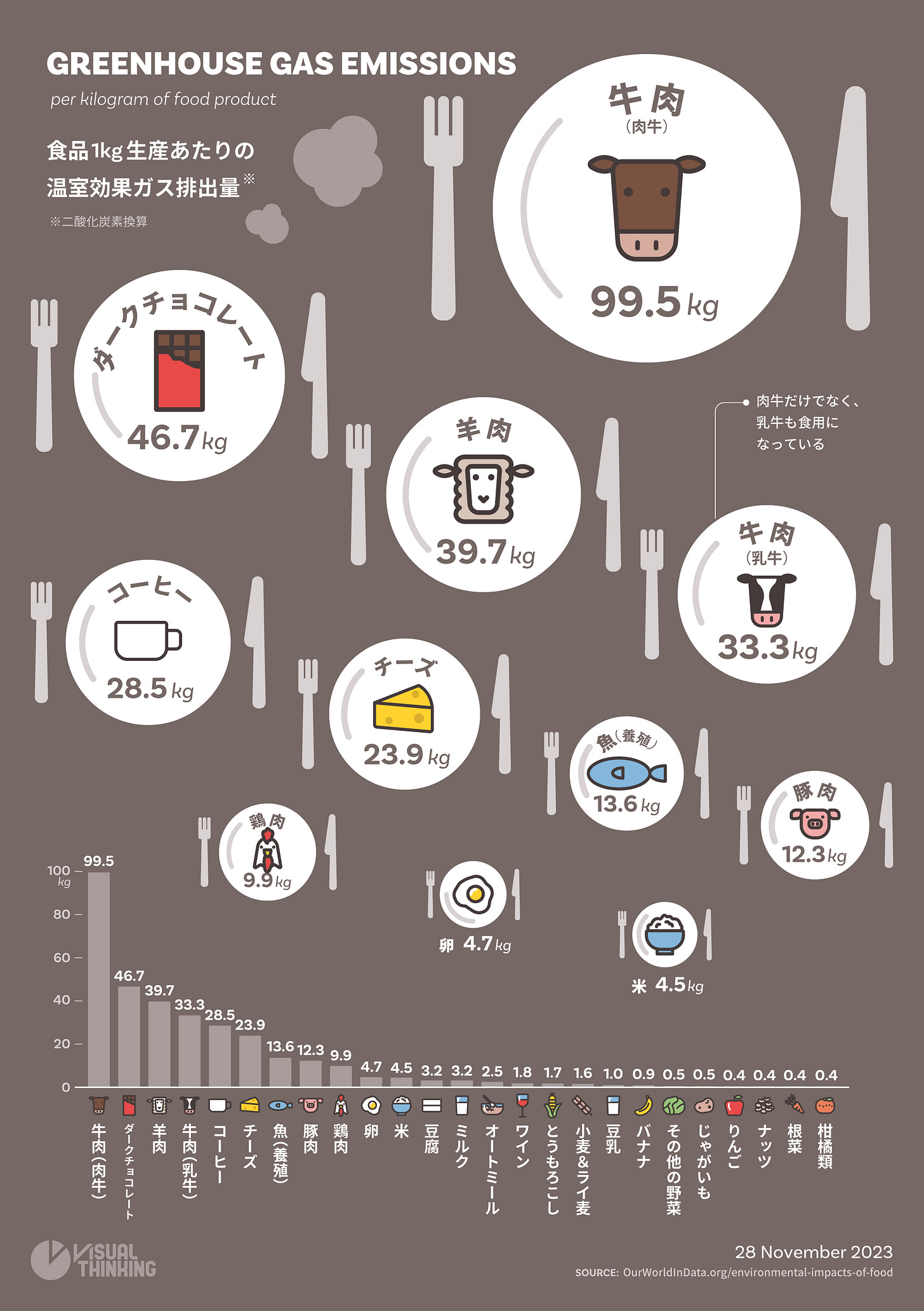 そういった意味で、今回使ったデータ「食品1kg生産するのに排出される温室効果ガスの量」は、日常と温室効果ガスを結びつける上で、良いデータだと思いました。