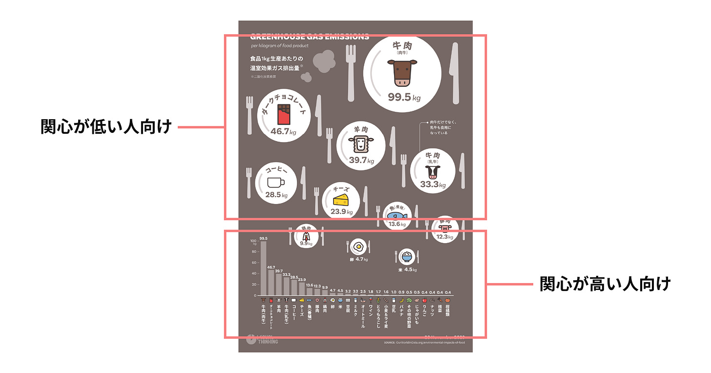 そこで今回はデータに親しみを持ってもらえるように、お皿の大きさで温室効果ガスの排出量を示すビジュアルをメインにして、補足的にインフォグラフィックの下部に棒グラフを載せることにしました。